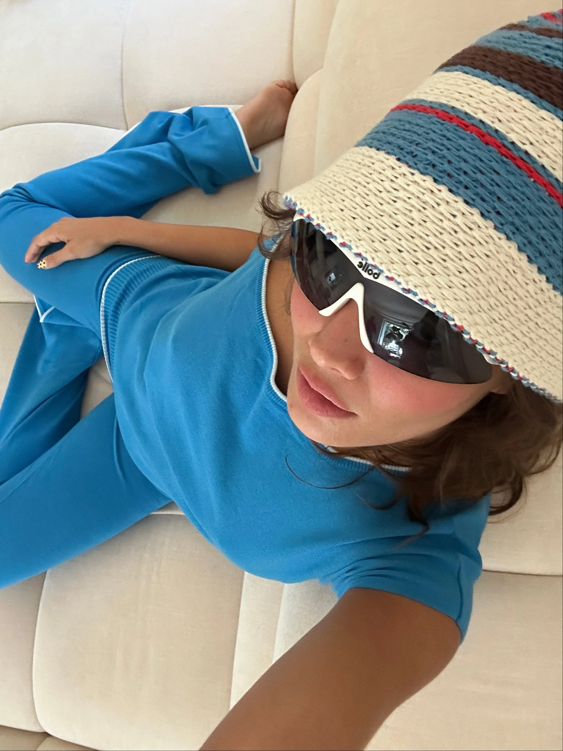 the maxine knit fold over pant in blue. ribbed fold over waist with baby blue detailed edge at hip and hem. soft to the touch with a lightweight and cozy feel. mid to high rise and fitted through the knee with subtle flare at hem.