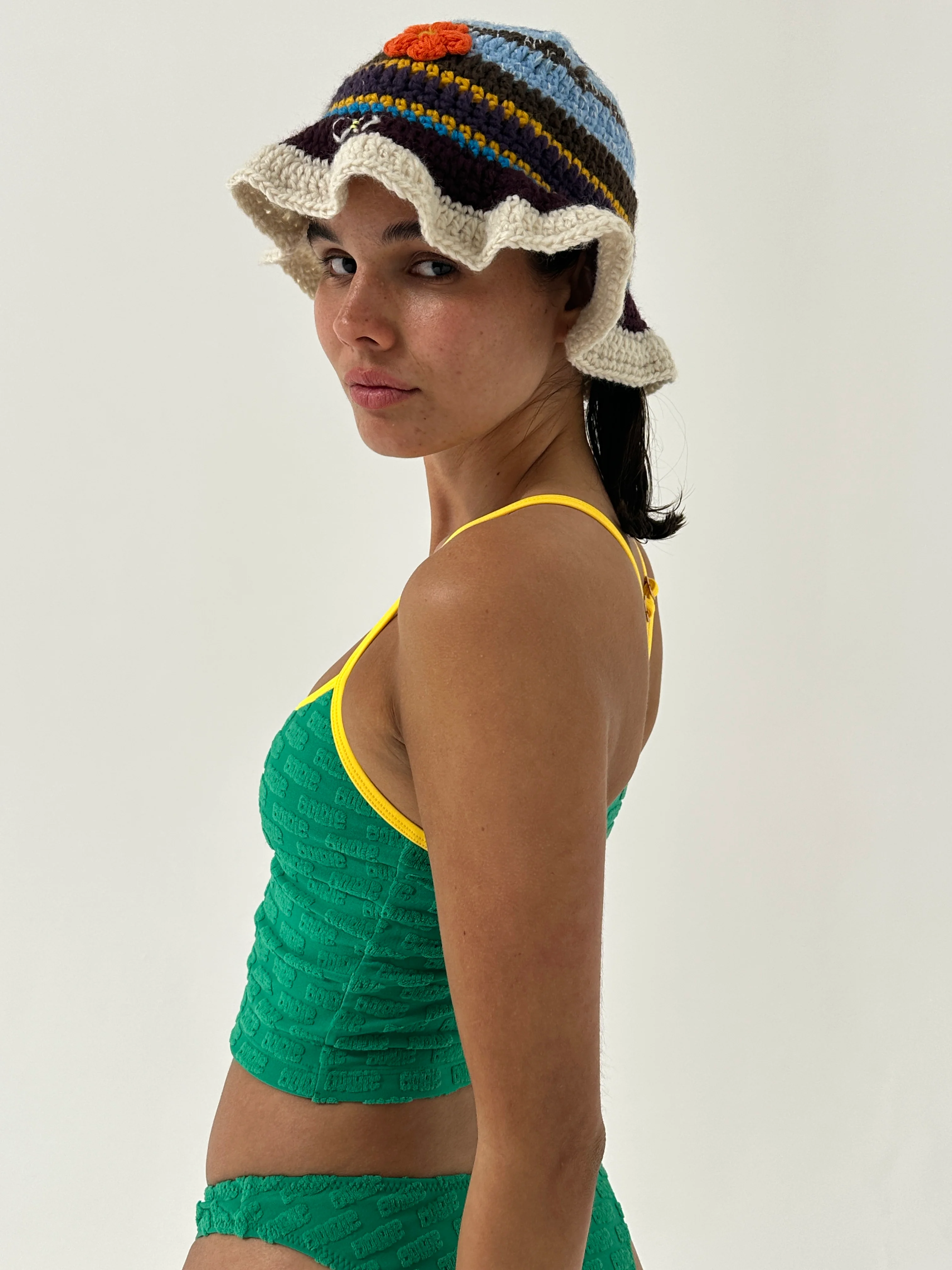 introducing the sonia tank top in our iconic green logo terry fabric. designed with a yellow contrast elastic seam, adjustable racerback straps and a seamless bottom hem. this top is swim and street friendly making it the perfect day to night go-to.