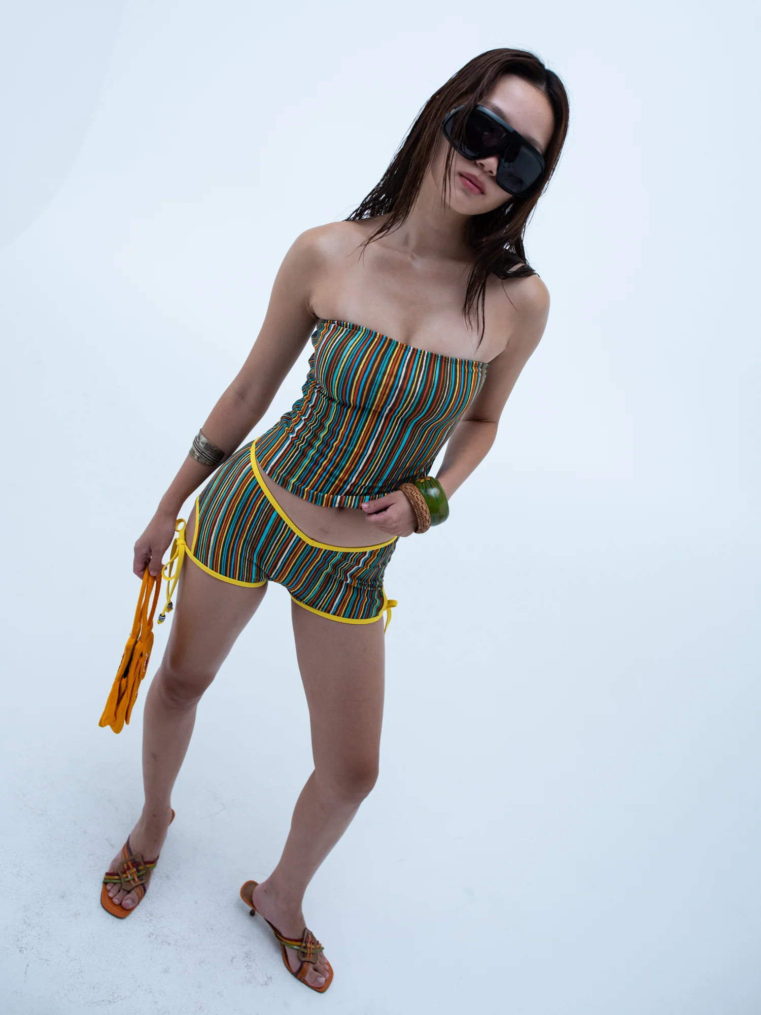 the best selling vivy short in our new custom ribbed print, key west. your new summer staple, designed with a flattering v dip and no frontal center seam. these shorts offer the perfect amount of stretch and durability needed for all your beach to street activities. wear on their own or over your favorite goldie bikini bottom.